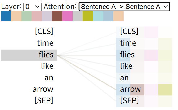 "Time flies like an arrow" 라는 sentense의 self attention 을 구하여 시각화 한 예임.