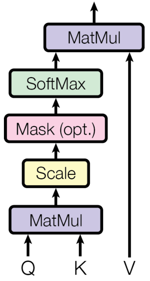 - scaled ($1/\sqrt{d_k}$) 는 embedding의 크기 $d_k$가 커질 경우, dot product의 값이 커지게 되어
